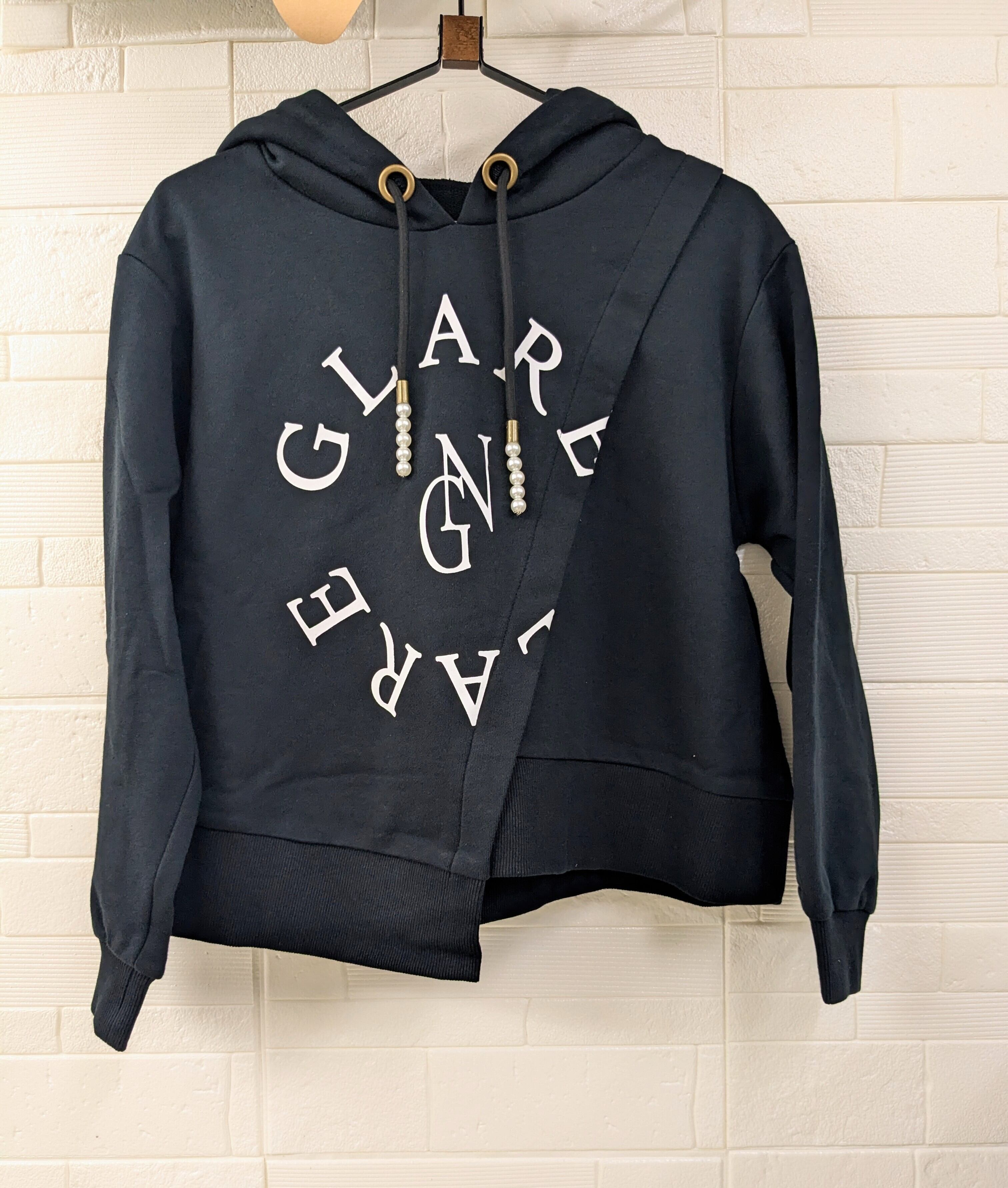 ● コンパクトなアシンメトリーデザインがオシャレ度を高めるミニ裏毛パーカー✨コンパクトなシルエットなのでボトムス選びも困りません。フードの紐はめずらしパールデザインで女性らしさある大人カジュアルコーディネートを楽しめます。