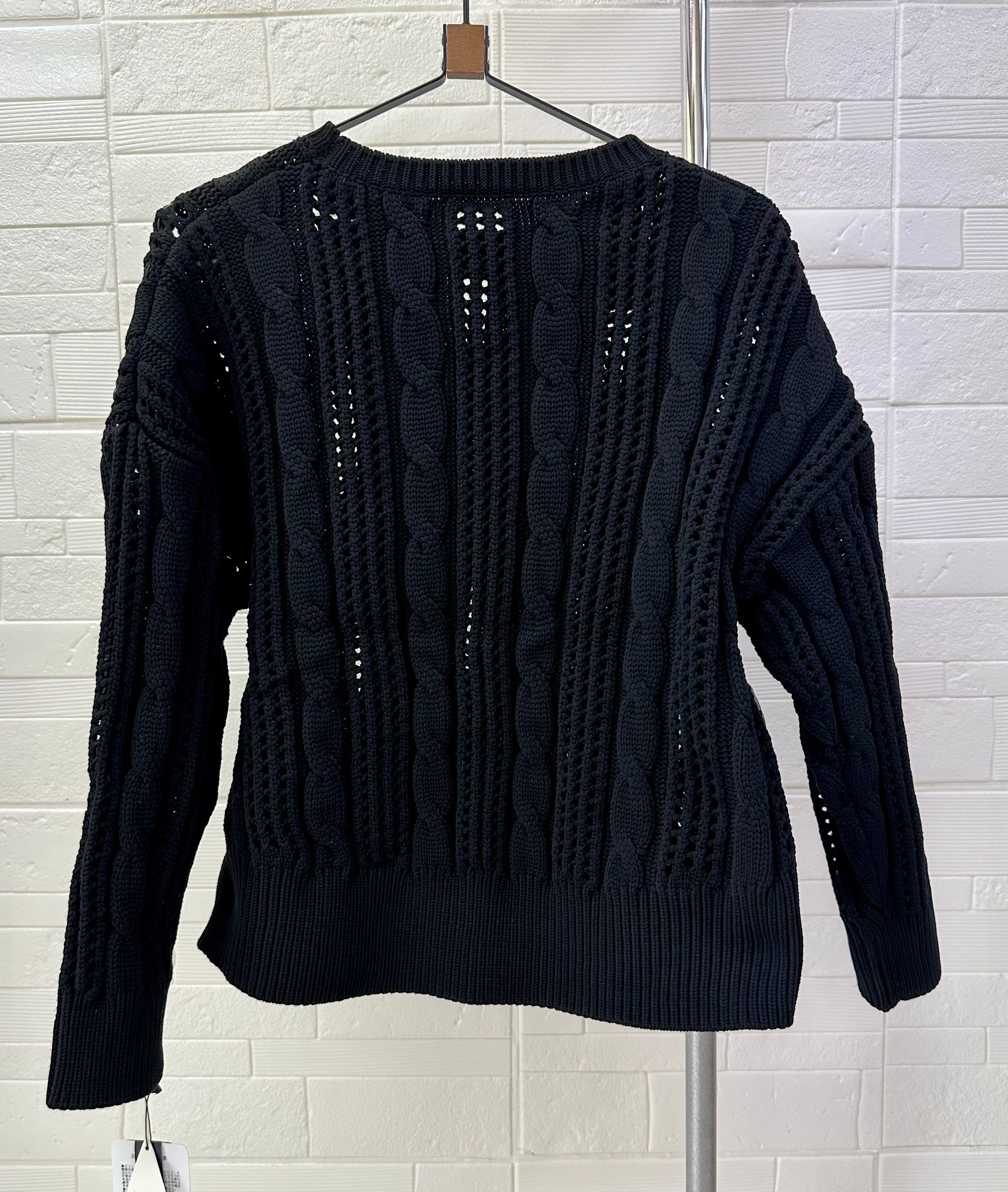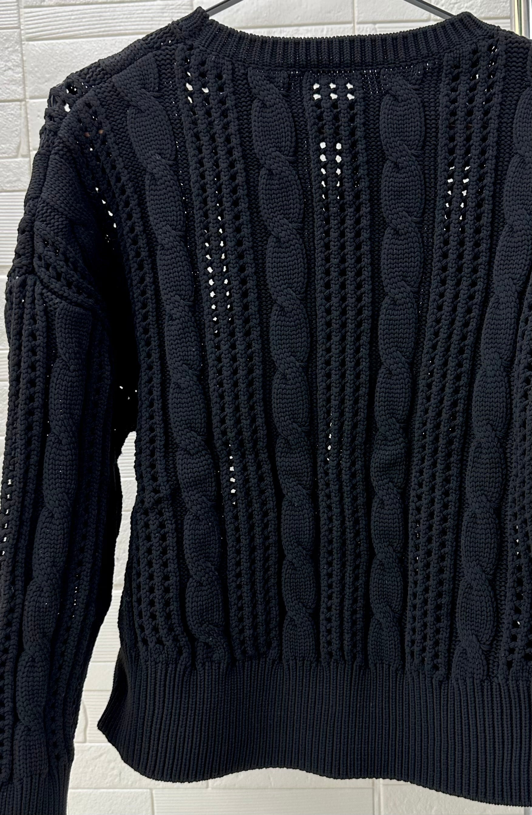 ● シフォンフリルが女性らしい印象を与える、編みニットの新作。程よく透け感のある編みニットにシフォンフリルが施されておりカジュアルな中にも華やかさがでます。オフィスやデートなど様々なシーンで活躍してくれること間違いなし。手軽に着こなせるポリエステルのニット素材です。周りと差をつけれるデザインニットです✨