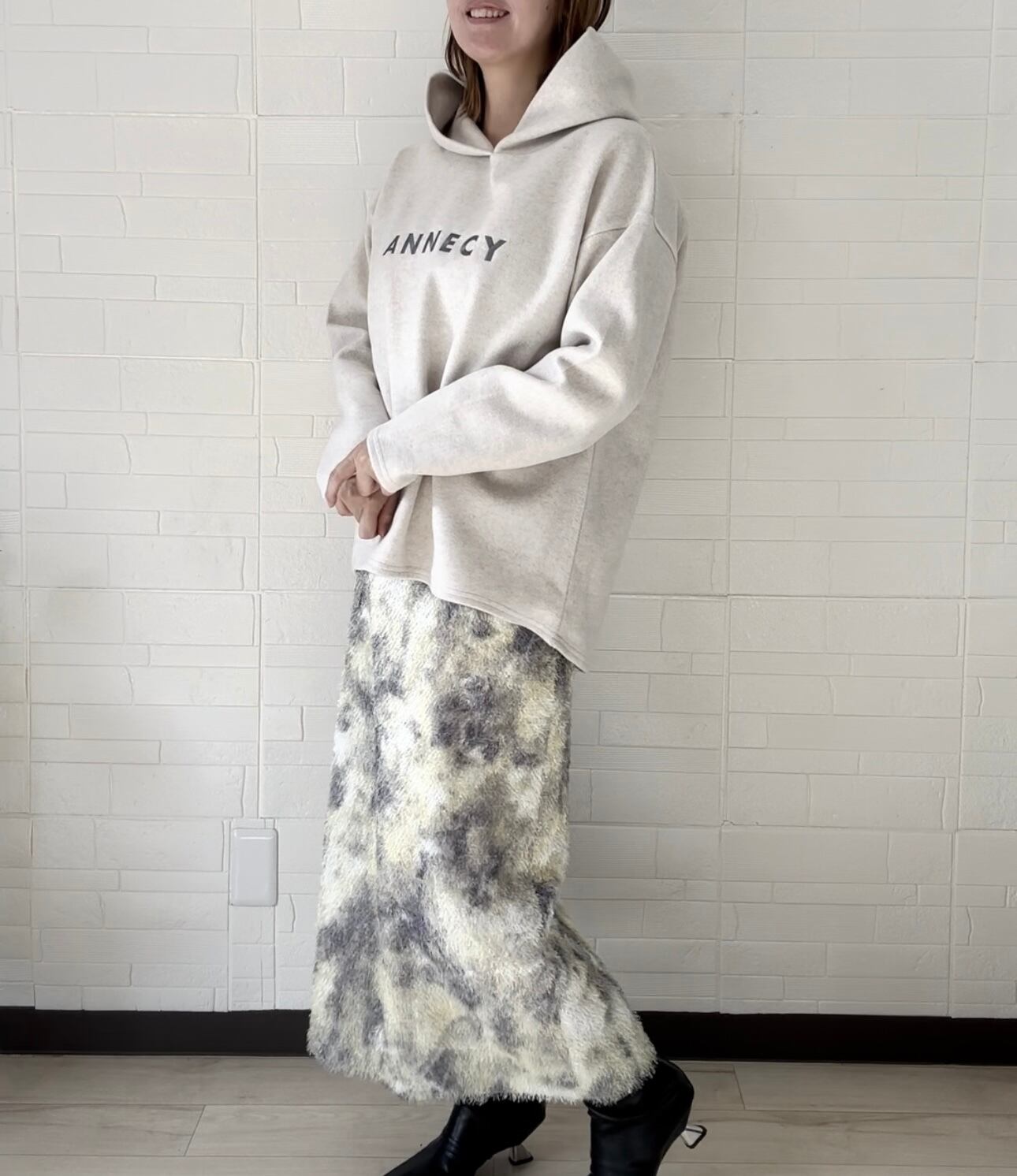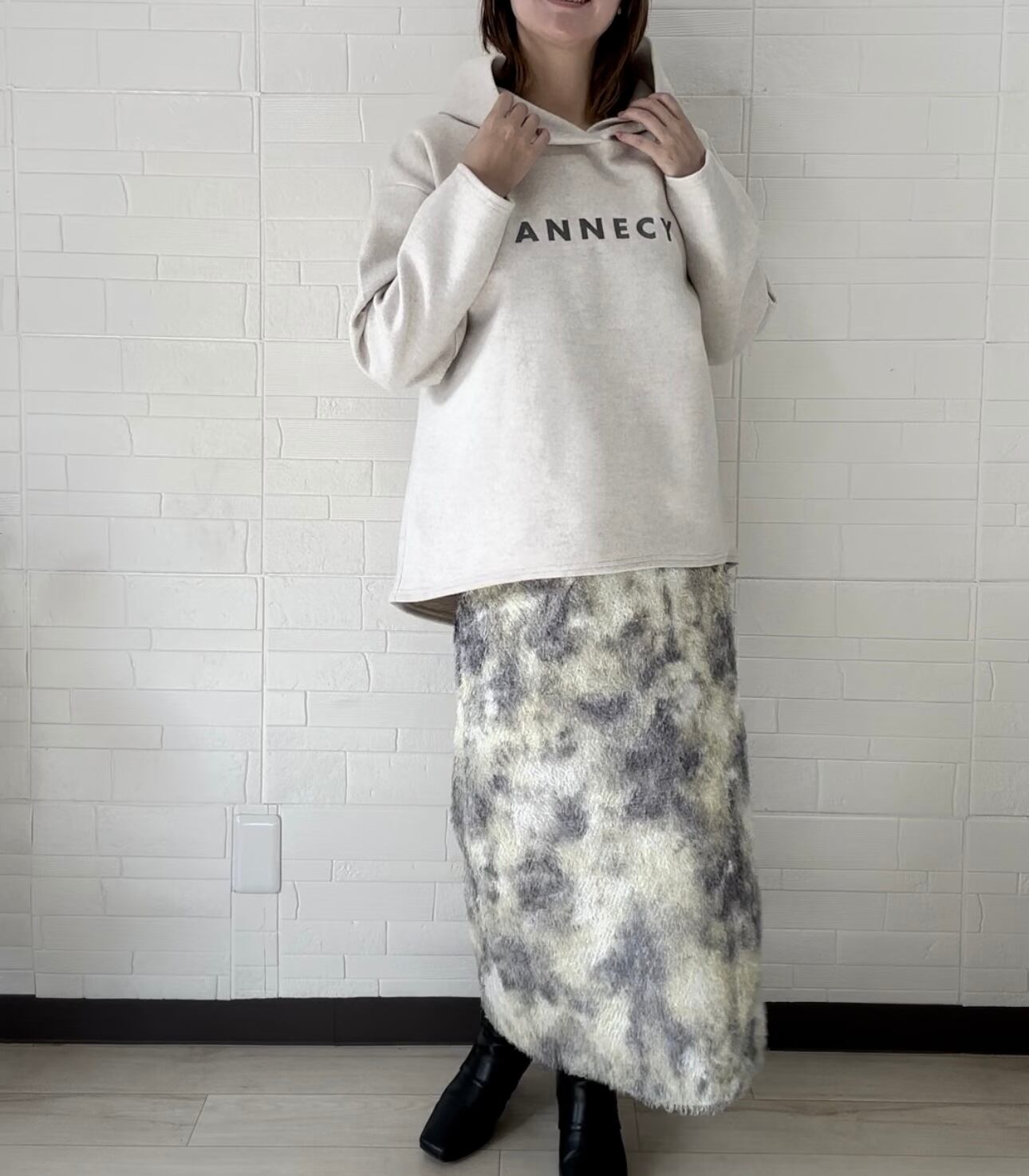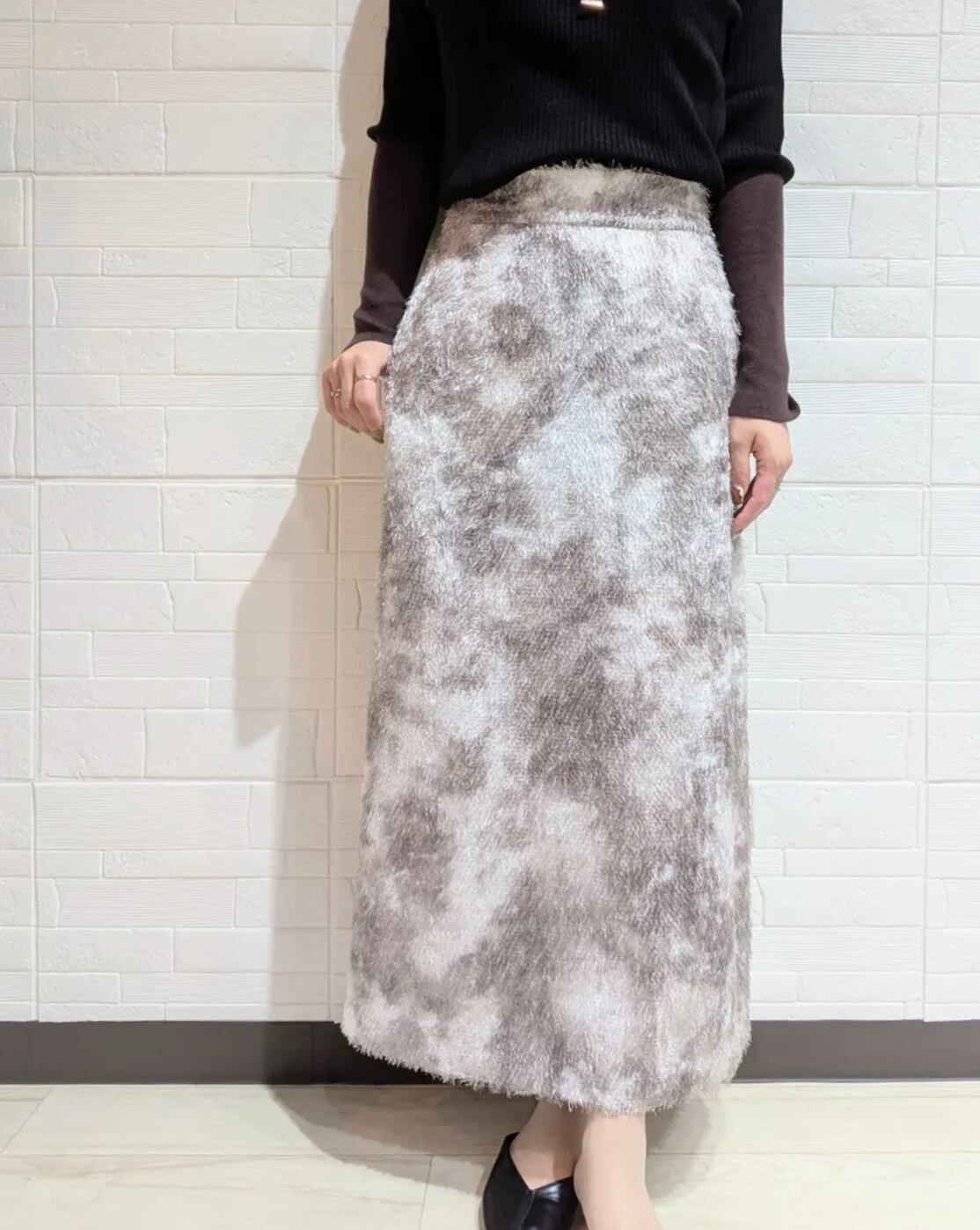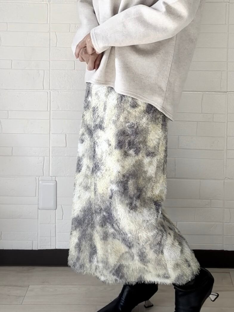 ゆるめのペンシルスカートで足さばきも良く、裏地も付いてるので着心地のよいスカートです。柔らかいシャギーは女性らしさを引き立ててくれオシャレで主役級なスカートです!