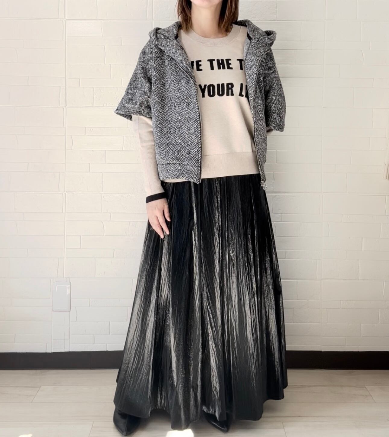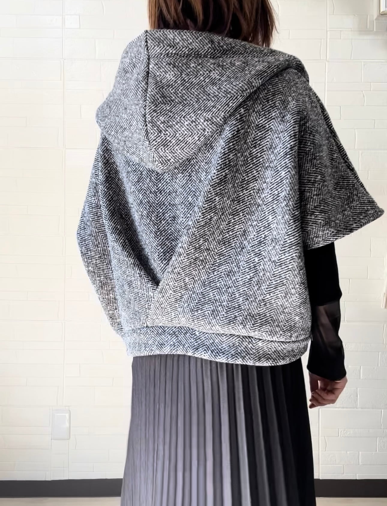 モノトーンでありながらもヘリンボーン柄で冬のアウターも重たくなりません。軽やかな着心地でもっちりとした素材感、しっかりと暖かさを保ちますので、これからの季節に大活躍すること間違いなしです!