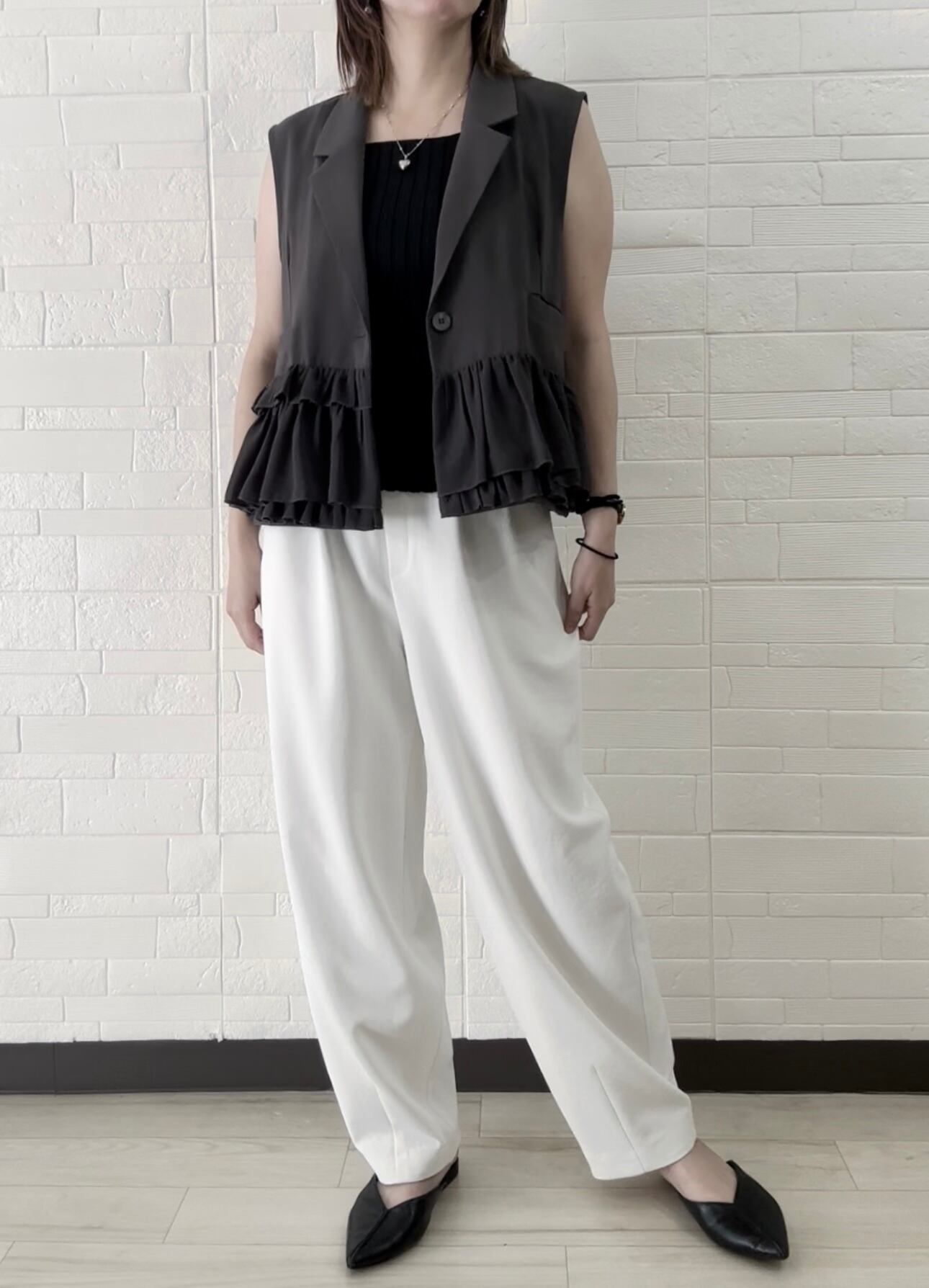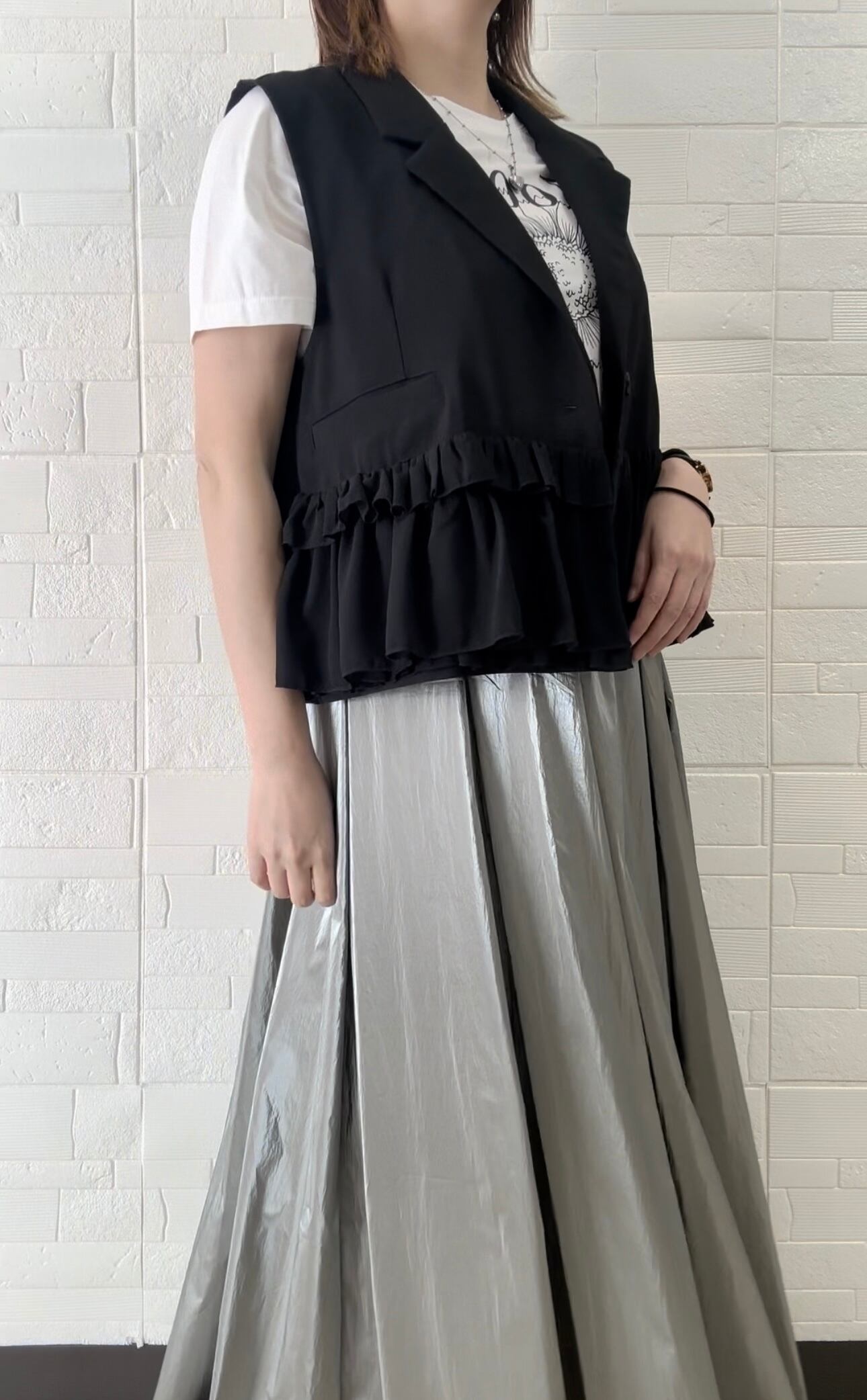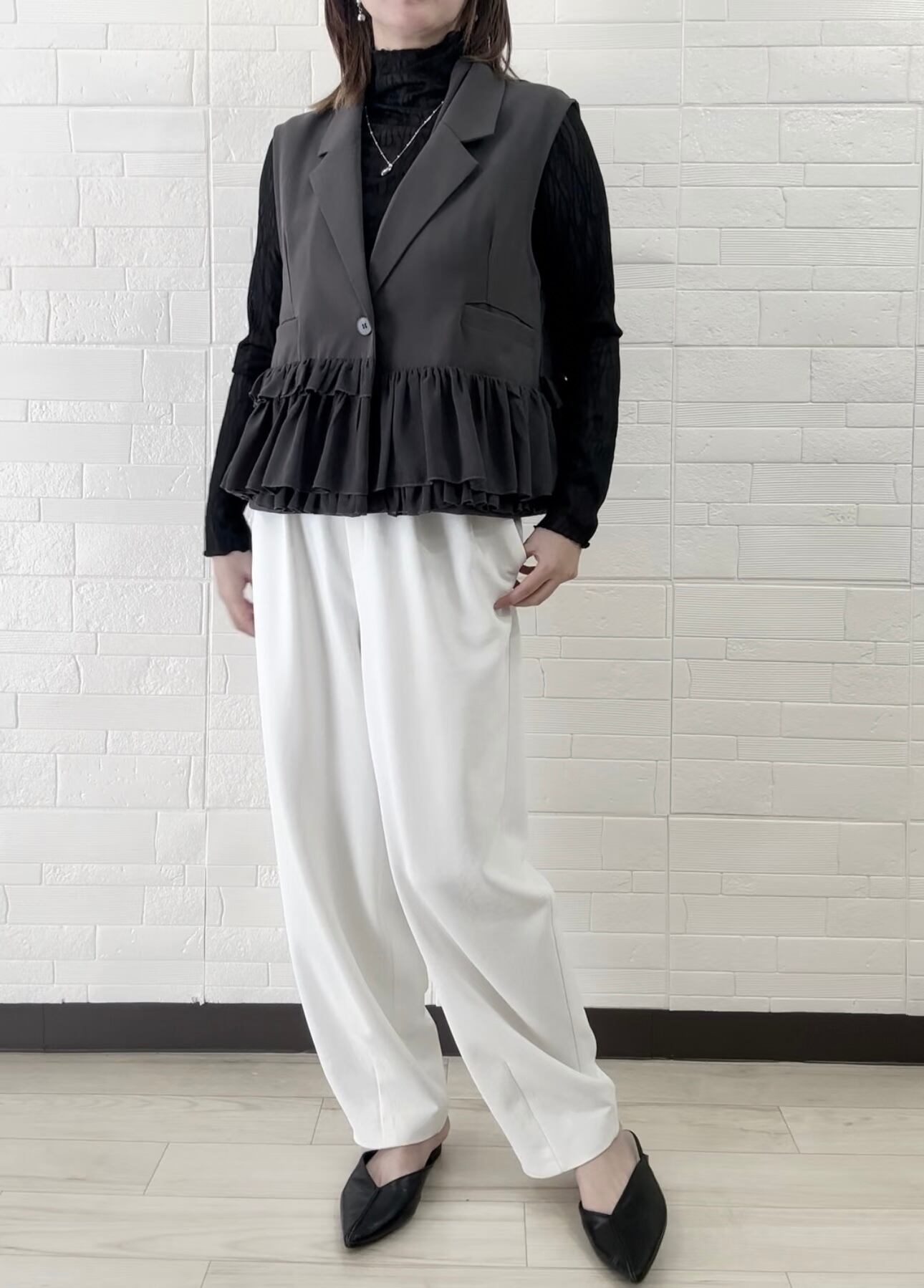 ● ショートフリルジレは、フェミニンでありながら洗練されたデザインが魅力のアイテムです!裾に柔らかなフリルが施されており、動くたびにさりげなく揺れる様子が大人の女性らしさを引き立てます。シンプルなトップスと合わせるだけで華やかな印象になり、また、カーディガン代わりの軽やかな羽織りとしても大活躍。特別な日からオフィスカジュアルまで幅広いシーンでお使いいただけます✨