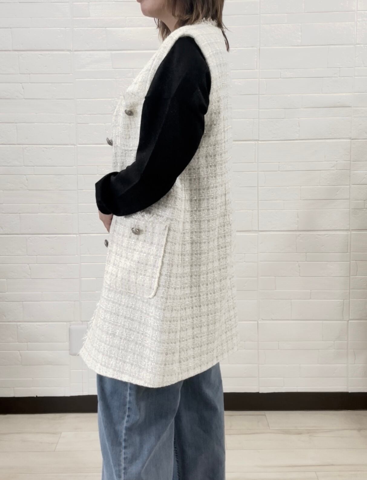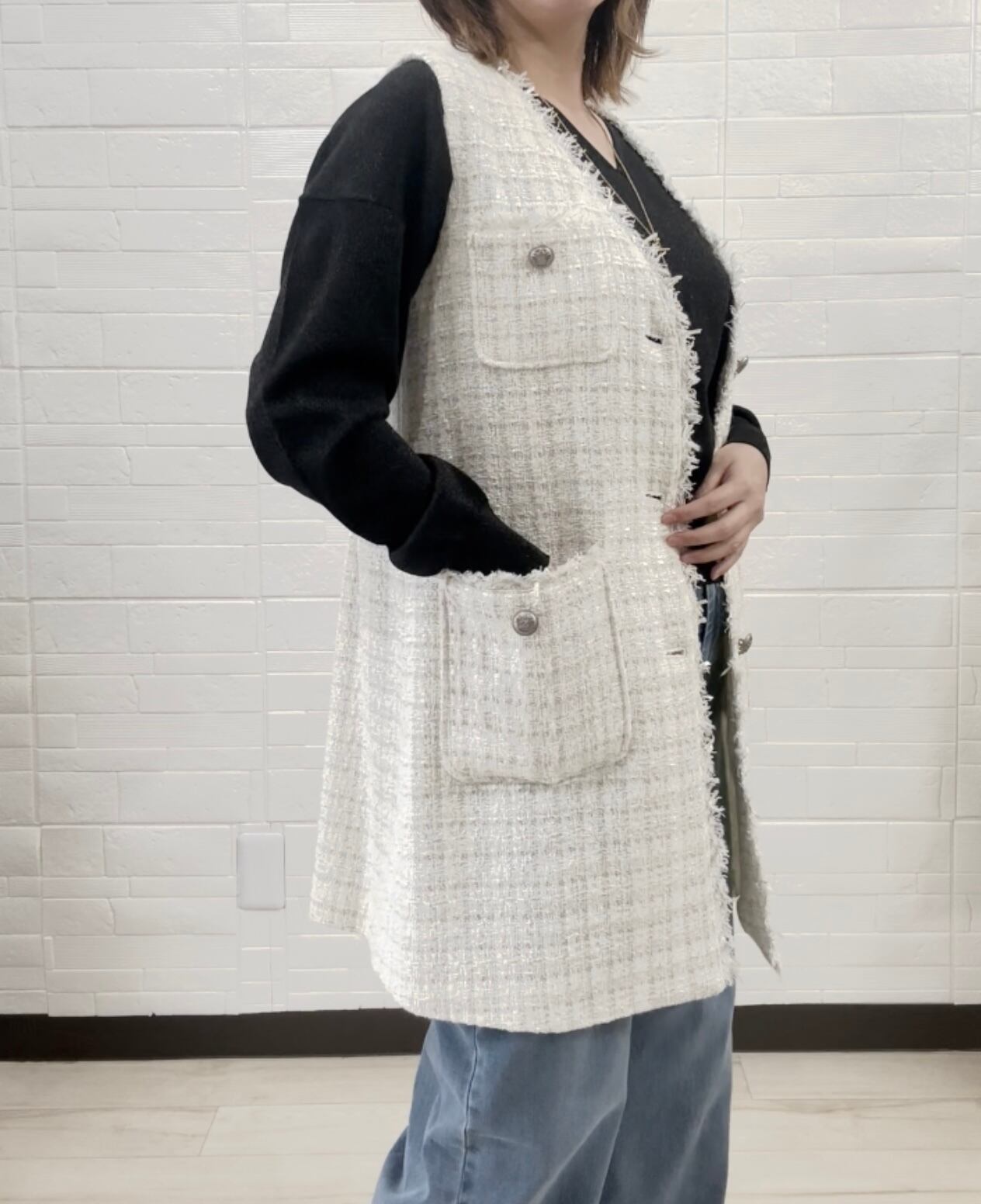 ● おしゃれな印象を与えるツイードジレ!シンプルなデザインながら、独特のツイード生地がアクセントになり、カジュアルからフォーマルまで幅広いスタイルに対応します。シルバーラメ糸が入り上品な輝きに、ボタンはアンティークに、フリンジが程よくカジュアルに、どのコーデの重ね着にも最適です。春コーディネートにぴったりの一枚です✨