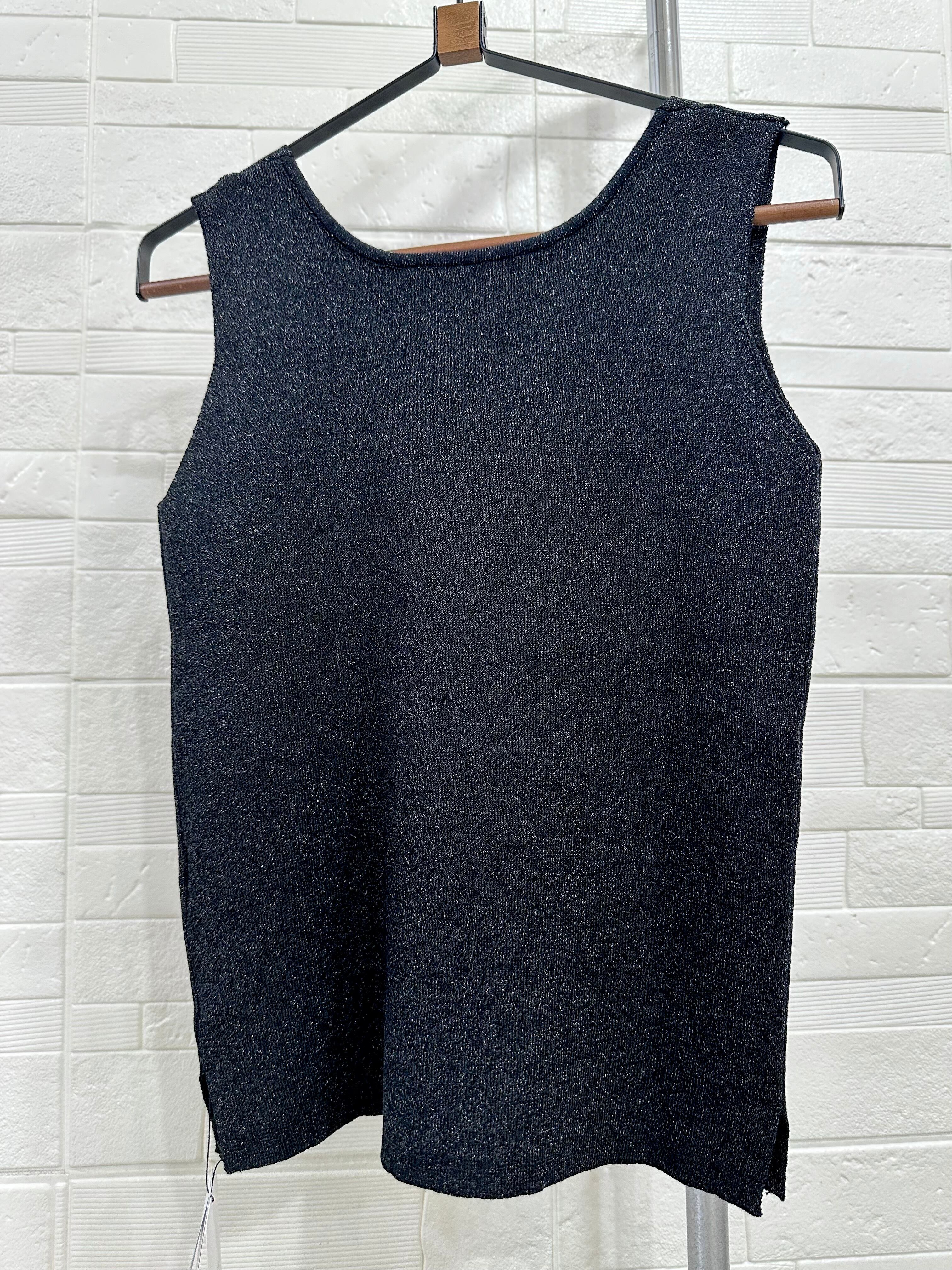 ● ラメ混の糸を引き揃えた、ゴム地のニットタンクトップ。定番のスクエアネックタンクトップと同じサイズ感で、着やすいシルエットにしています。